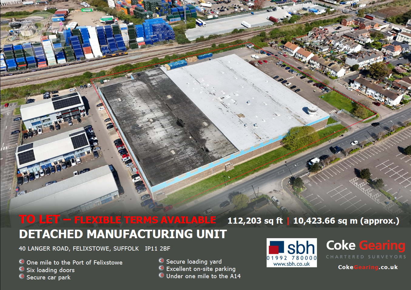 The property is located on Langer Road, as part of an established industrial/ warehouse area. The entrance to The Port of Felixstowe is less than a mile away.